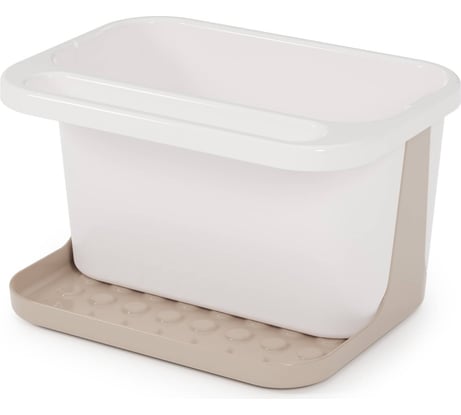 довольно таки крупная подставка,помещаются два средства для посуды (высокие) и внизу удобно размещать губку.