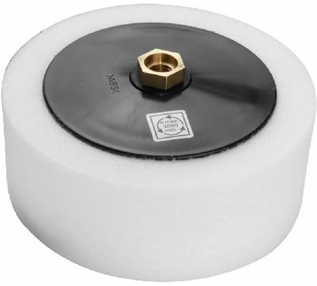 Крепится на сам шпиндель, резьба если мне не изменяет память М14 (стандартная), накручивается без проблем, шайбы только снять надо. Материал крепежной гайки металл. Материал губки мягкий, затирает царапины превосходно.