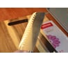 Прекрасный нож. Довольна им на 100%. ручка прорезиненная - не скользит в руке, даже когда нож мокрый или жирный, резать удобно, рука не касается стола при резке