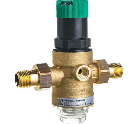 Компактность. Допускается установка вертикально, и горизонтально. Ремонтопригодность - ремонт заключается в замене внутренней вставки D04FMA, для чего клапан даже не надо демонтировать, нужно просто отвернуть пластмассовую часть корпуса - опыт, навыки не требуются. Для регулировки имеется рукоятка, но вместо нее можно использовать и отвертку. На корпусе одновременно две резьбы - 1/2' и 3/4' наружная. Резьба под манометр 1/4' - можно ставить манометры любого производителя.