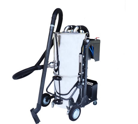 Пылесос с отдельно стоящим циклоном, установлен на одну платформу. Две турбины мощностью 2,4 кВт. Корпус пылесоса изготовлен из стали. Большой бак на колесах. Произведен в России.