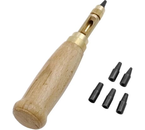 Удобный в пользовании, насадки менять легко. Качеством довольна. Использую по назначению - для пробития кожи, особенно удобно пользоваться в труднодоступных местах, куда не пролезает дырокол с ручками с насадками по кругу.