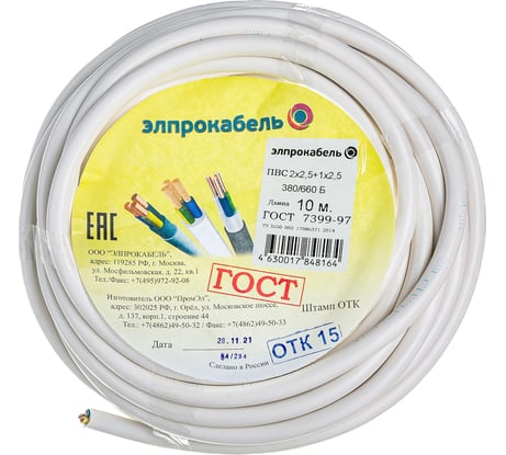 не соответствует длине и сечению. 2.2мм. вместо заявленного 2.5мм. квадратных и длинна 9.85 вместо заявленных 10м.