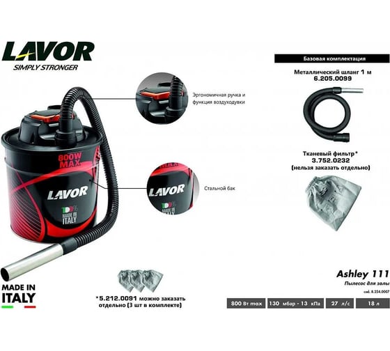 Электрический пылесос для золы Lavor ASHLEY 411, 1000 Вт 40029-00010