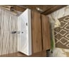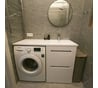 Глубина тумбы позволяет размещать много средств для стирки и уборки в доме .Форма раковины современная и отлично вписывается в современный дизайн ванной комнаты.