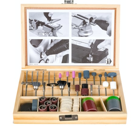 Хороший набор насадок, удобный кейс, насадки сидят довольно плотно, что исключает выпадение. Диаметр хвостовика насадок 3.2мм, так же в комплекте есть 4шт цанги, что дает, возможность использовать разные диаметры насадок. Единственное что для меня было минусом так то, что в наборе нет отрезного диска по дереву.