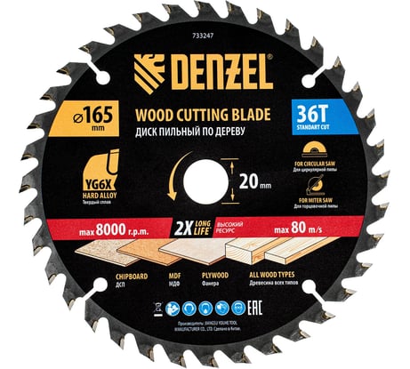 Отзыв Пильный диск по дереву DENZEL 165x20 мм, 36 зубьев 733247
