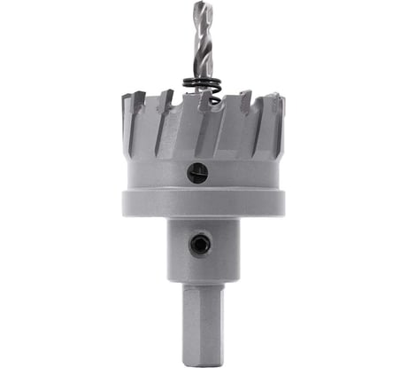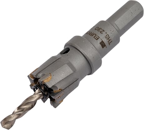 Коронка с твердосплавными рабочими кромками. Режет металл очень быстро даже обычным шуриком, засыпая всё вокруг раскалёнными опилками с цветами побежалости. Пробовал на 4 мм полосе - проблем 0. Пробовал только на СТ3, но уверен с другими материалами тоже справится. Пластики может просто разломать.