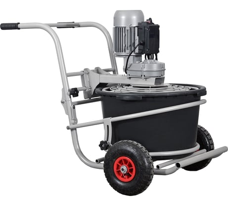 Заливали стяжку теплого пола. Мешает хорошо. Не брызгается, как бетономешалка. На стенках и дне не оставляет комков. Тележка очень выручает. Даже не представляю, если бы мешали ручным миксером и носили в ведрах. Очень удобная тележка и откидная ручка очень кстати при выгрузке смеси. Но есть нюансы: 1. Бак не фиксируется. При густой смеси начинает вращаться и приходится держать его. 2. На лопастях остаются комки смеси и приходится останавливаться в процессе и скидывать их. Но это один раз. Далее все норм. 3. Очень густую смесь не прокрутит. 4. Тележку неудобно вставлять, так как съезжает с полозьев. 5. Если вставить тележку не до упора, то не включится.