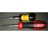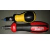 Рукоять маленькая, но ухватистая, удобная. Красное - пластик, чёрное - резина. На рукояти присутствовал облой пластика, который я удалил, чтобы он не царапал руку при работе без перчаток. Посадочное место у этой отвёртки достаточно глубокое, чтобы держать биты с хвостовиком E (50 мм и длиннее) без люфтов. На фото для сравнения у жёлтой отвертки обычная глубина посадочного места, там биты с хвостовиком E держатся неплотно, присутствует приличный люфт.
