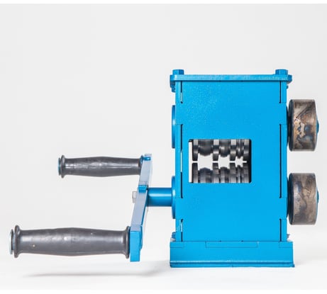 Прекрасное конструктивное исполнение. Разборный. На фото корпус выполнен полностью сварным. По факту - на болтовых соединениях, что очень обрадовало. Возможна смена (установка) вальцевых роликов с другим фасоном проката (профиля обжимной полосы для художественной ковки). Возможность регулировки ведомого ролика под нужную (имеющуюся) для прокатки полосу толщиной от 0 до двух миллиметров. Возможность разработки и подключения электропривода к устройству.