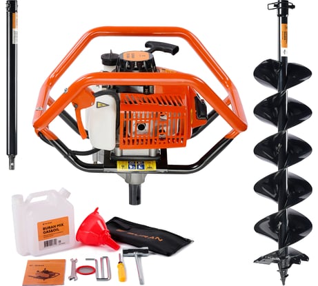 Пришёл в разных коробках, распаковал, осмотрел, убедился, что всё в порядке. В коробке движка полезная мелочёвка, как в описании. Комплект выгоден и удобен под задачи с глубиной лунок до полутора метров. Мы использовали удлинитель для установки высокого забора сетки рабицы, где нуждались в более глубоких лунках. Основной же объём работы - посадочные ямы, работали на участке 2га где высаживали виноград, на каждый саженец одна ямка глубиной до 70см, ширина как у шнека 20см. На дно закидывали лопату верхнего слоя почвы вперемешку с полстакана удобрения и сверху ещё лопату почвы. Вода, саженец, засыпать. И следующая лунка. Один бурит, второй сажает и всё это в хорошем темпе. За полную неделю интенсивной работы имели результат 3300 посадок на огороженной территории. По опыту могу сказать, что далеко не каждый бур у нас выдерживал такой темп, собственно, последний случай и привёл нас к покупке новой лошадки. Буран не подвел, работал исправно.