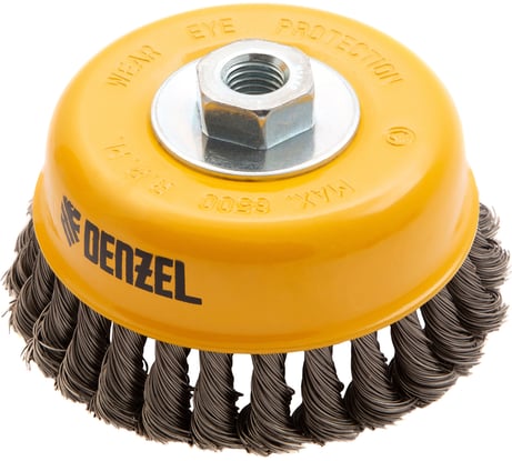 Не бьёт, щетина не вылетает. Работал на скорости 11000 об/мин. Покупал для зачистки профиля 40 мм. Для такого размера профиля размер щётки оказался подходящим.