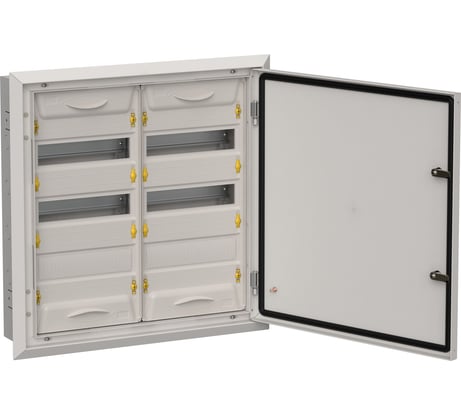 Шикарный щит. Массивный, тяжелый, металлический. Дин рейки стоят немного близко, но подключать при умении все равно удобно. В щите есть просечки под ввод с боковых граней, 4 встроенные шины, возможность снять платформу с Дин рейками для удобства монтажа. Жалею, что не нашел его 2 года назад, когда делал себе загородный дом и пришлось спаривать 2 по 84 в квадратном исполнении. Этот на брал себе 3 комнатную квартиру 60 меров. Под 3 фазы ввода.