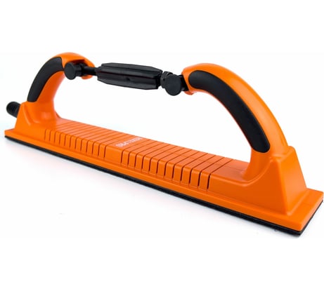 Качественный пластик, регулируемая гибкость, липучка, под нее подобрать размер или купить листы и рвать под размер-крепятся быстро и удобно.Размер не такой уж маленький самого шлифка, но в руке лежит уверенно и удобно. За счет гибкости могу использовать на разных поверхностях.