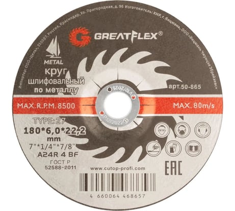 Отзыв Диск шлифовальный по металлу Т27 180x6.0x22.2 мм Greatflex 50-865