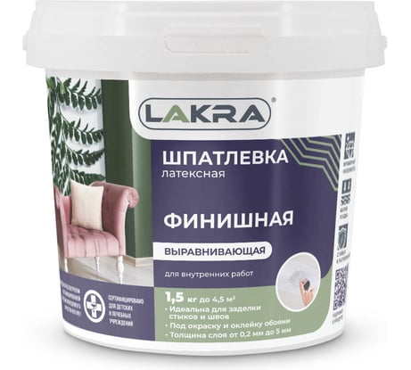 Шпаклевал потолок из гипсокартона этой финишной шпатлевкой Лакра. Готовая к применению, не нужно размешивать с водой. Наносил шпателем тонким слоем 1-2мм на стыки и саморезы. Хорошо ложится, не трескается при высыхании. Легко шлифуется наждачкой. Расход экономичный. После грунтовки красил без проблем.