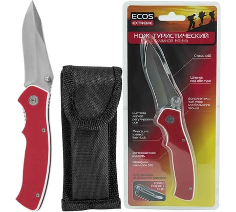 За свою цену вполне себе неплохой нож. Лезвие в открытом состоянии фиксируется замком типа Лайнер-лок, так что себе на палец не закроется, что например было у меня с Викторинокс, Накладка на ноже из пластика G-10, красного цвета что лучше заметно при походной жизни, длина и толщина клинка достаточна для бытовых нужд, заточка заводская нормальная. Чехол мягкий из нейлона для подвеса на ремень. Нож имеет клипсу для ношения в брючном кармане.