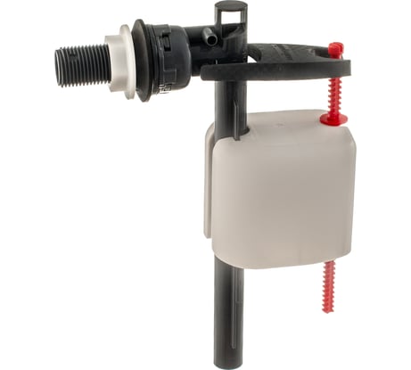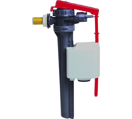 Телескопический, под бачки любой высоты. Компактный, особенно головка клапана, ее диаметр 40 мм (примерно. точно мерять было лень). Это важно, т. к. ввод воды в бачок обычно располагается близко к стенке бачка и большая головка может упереться в стенку. Входной штуцер не цельнометаллический, внутри него пластик, впрочем слой металла довольно толстый. Глубина сработки регулируется сверху, винтом - удобно. Фильтр грубой очистки с успокоителем потока в комплекте, установка по желанию, внутрь штуцера. Из недостатков - хлипковатое коромысло, которое запирает клапан.