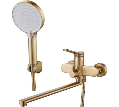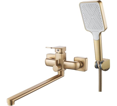 Цвет золотой сатин матовый, практически не пачкается и не оставляет вообще никаких отпечатков в отличии от хрома, большая годная лейка и качественный крепеж, сидит как влитая и ничего не болтается. Шланг тоже хорошего качества. Гусак тяжеленький, сделан явно не из фольги.