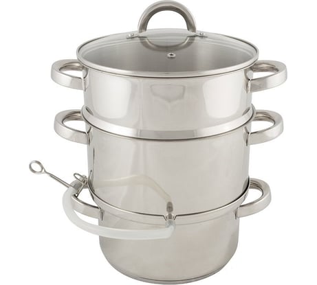 Ранее у меня была алюминиевая соковарка, но алюминиевую посуду не рекомендуют ставить на стеклокерамическую плиту, типа оставляет белые следы, поэтому отправил её на дачу на газовую плиту, а также в ней плохо входили секции одна в другую и вынимались т.д. У этой соковарки всё отлично. Хороший размер дна под комфорку, нержавейка, большой объем емкости для яблок/груш/ягод - 8л, можно ставить на стеклокерамику, секции хорошо и легко входят одна в другую и легко вынимаются, прозрачная крышка, нормальная отводная трубка и ее фиксатор, однозначно рекомендую.