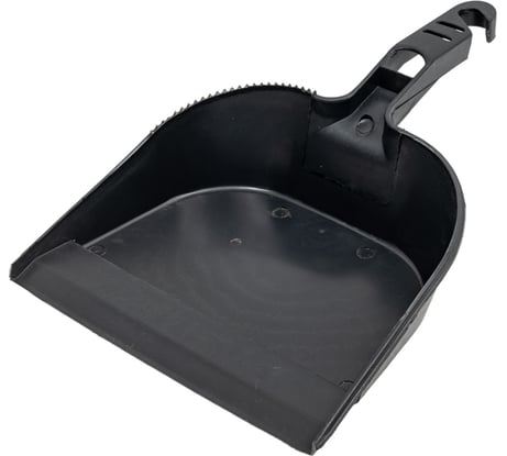 Совок из пластика. Пластик не гибкий, толстый. Цвет - черный. Ширина кромки - около 22 см, угол-достаточный для заметания среднего и мелкого мусора, для заметания пыли приходится совок приподнимать за ручку - делать угол чуть меньше. Ручка - трехгранная, нижней (задней) стороны нет. На ручке есть крючок (а так же прорези и техническое отверстие) - можно вешать (выступ гвоздя, самореза, кронштейна - не менее 25 мм - исходя из толщины ручки - что бы не падал). Хороший рабочий инструмент без лишних изысков.