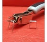 После покупки строительного степлера задумался о перетяжке стульев и, для извлечения старых скоб, был приобретён данный девайс. Максимальная длина скоб, которые я извлекал - 14 мм (на фото). Находясь в одной плоскости со скобой 14-ю скобу достает, но уже ручкой упирается в материал.