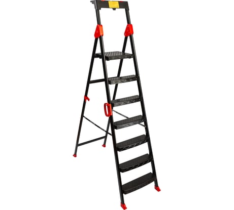 В целом хорошая стремянка. Подходит для внутриквартирного использования "в тапочках", где-нибудь в магазине или на складе. На стройке, возможно, проживет недолго. Ступени, хоть и пластиковые, имеют усиление в виде стальной профтрубы 20х30 мм. Также ступени и площадка усилены ребрами жёсткости, так что с прочностью всё ок. Пластиковый органайзер заменяет металлическое соединение двух боковых продольных труб, что несколько странно. Вес, естественно, больше, чем у алюминиевых аналогов, но это особенность материала, а не недостаток.