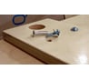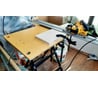 Хороший в исполнении, жесткий добротный верстак после небольших доработок. см. ниже ... Отзыв написан по итогам 6 летнего опыта его эксплуатации. О покупке не жалею, вопрос о его замене на другой (после самостоятельно внесенных улучшений) не встал... Верстак стал реально постоянно незаменимым помощником после установки на него накладной быстросъемной без крепежа столешницы из фанеры 21 мм размерами 800x600 мм (см. фото ее конструкции ниже). Размеры накладной столешницы выбраны так, чтобы иметь выпуск по 10 см со всех сторон от алюминиевой раздвижной столешницы верстака. От большего выпуска отказался чтобы не нарушить устойчивость всего верстака при работах. Круглые отверстия 60 мм с одной стороны в углах были сделаны для удобства переноски накладной столешницы (т.к. нужно периодически переносить верстак как между объектами и этажами на стройке) и возможности сверления насквозь. Крепление столешницы на верстак выполняется за счет зажатия его средней выступающей части подвижными створками верстака. Применение накладной столешницы позволило расширить области применения верстака в т.ч. для работы с электро и ручным инструментом (торцевая и ручная пилы, фрезер, реноватор, лобзик, шлифовальная машина, точило, стойки для дрели, слесарные тиски, струбцины и т.д, даже склейка, сборка, покраска кистями и сушка деталей), превратив его в универсальный верстак.