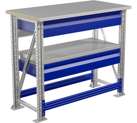 Отличный компактный вёрстак. Удобство сборки и перевозки в упакованном виде. В собранном виде не хрупкий, можно добавлять ящики, полки и перекладины. Можно соединять в единый длинный верстачный стол благодаря конструкции стеллажей. Очень продумано решение. Толстый лист оцинковки на фанере.