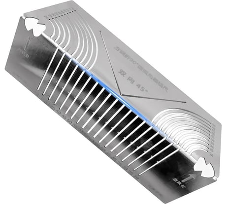 Сосед купил себе на дачу, и я взял попробовать. Как по мне - хрень полнейшая. 1: Непонятно, почему начали с 20-ки. Как-то пришлось варить детскую мебель, так там подстулье было из пятнашки, и круглил я его так же. А вот от такого количества ненужных рисок в глазах рябить начинает. Ну а если нужные помечать - в общем, манки бизьнес. 2: Бессмысленная покупка. При массовке ковыряться с перекладыванием и прицеливанием этого шлепка - половину рабочего времени на это угробишь. Для этого есть другие мерки. Я себе давно уже нарезал-нагнул таких профилей-шаблонов из листа дюраля и обрезков труб следующего размера, вклеил магнитики - и всё стало намного проще и быстрей. А для дома - много ли подобных дел, да с таким количеством размеров? И будет потом валяться. Ну а при нужде без неё всё легко решается циркулем, линейкой и куском картонки. И 3: Почему цена за дырявый полусогнутый листик пластмасски больше, чем за какой-нибудь сложный инструмент? В Китае пластик стоит полторы сотни с доставкой, металл - 230-250. И даже это слишком много за кусок примитивной штамповки. Я как-то брал там для нашего станка детальку с профилем на порядок сложней - обошлась всего в 115 рэ с доставкой. Потому что редко нужна. Хотя здесь такая - 2700! Вот такая пертурбация. Спрос, однако! Не знаю, как кому, но мне жалко отдавать больше полтыщи за это барахло. Я лучше лишнюю пачку электродов, катушку проволоки или полсотни наконечников прикуплю. Но судя по ажиотажу на площадках, любителей подобных "гагаджетов" не убывает.
