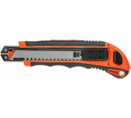 Один из трех ножей 18 мм, которые я постоянно использую в работе (для удобства все три ножа разного цвета и со своим назначением). Вполне удобный нож по невысокой цене. Фиксатор лезвия пластиковый, но вполне крепкий (бешенных нагрузок на нож не даю).