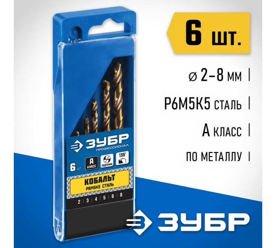 Набор сверл по металлу ЗУБР Кобальт 6 шт, 2-8 мм, сталь Р6М5К5 29626-H6