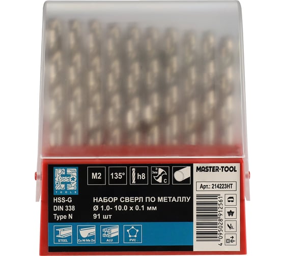 Набор сверл по металлу 1-10 мм, DIN338, HSSE-Co5, 135° 19 шт H-Tools 215214ROHT