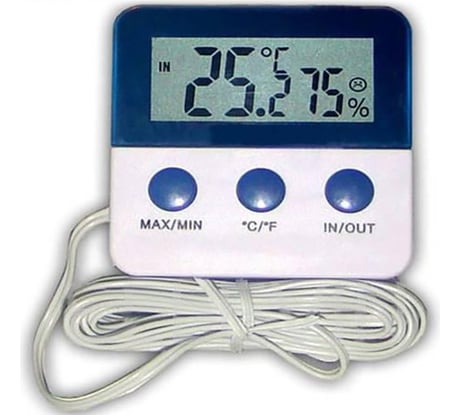 длинный внешний провод, запоминает мин и макс температуры отдельно для внутреннего датчика и внешнего