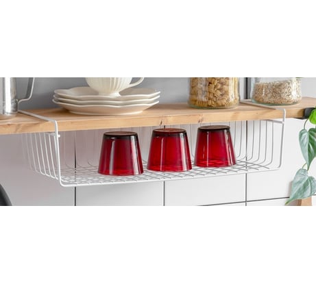 Недостаточная высота. Высокие кружки не поставить. На стандартную стеллажную полку не надевается. Отсутствует передний ограничительный бортик. Можно конечно "доработать" перегибом несущих.