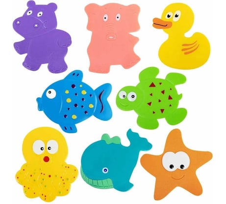 Набор ковриков для ванной в виде морских обитателей выполнен из ПВХ. Выглядит надежным и крепким, используем больше месяца. На упаковке есть информация о безопасности материалов для детской продукции, мне это важно, я всегда обращаю внимание на это. Понравилось, что фигурки довольно яркие и хорошо заметны под водой. Малыш любит их доставать, хоть и получается у него с трудом, так как присоски очень крепкие. Потом самостоятельно клеит на стены, на ванну. Может проиграть с ними все купание. Тактильно они очень приятные, имеют разные рельефные узоры в виде капелек, треугольников и пр. Коврики небольшого размера около 10-12см, это надо учесть при покупке, так как против скольжения наверно нужны побольше. Но мы такие и искали, компактные для игры, поэтому покупкой более чем довольны.