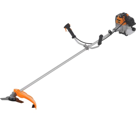 хилый руль, алюминиевая труба, при попадании на пенек в траве смялся, пришлось сделать новый из стальной трубы, переделал ремень с карабином для вывешивания косы как у дорогих брендов, штанга вроде бы жидковата, но удары по земле для выброса лески выдерживает, режущий диск не очень для скашивания кустарников,пойдет для скашивания твердой травы и мелкого кустарника, при отработке одного бачка на крупном кустарнике необходимо точить, катушку лучше купить хорошую