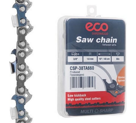 Производитель заявляет, что цепь изготовлена из высококачественной инструментальной стали. Проверить пока нет возможности. На звеньях отчеканен логотип "eco", а значит это не самый дешевый OEM китаец. На цепи присутствует смазка.