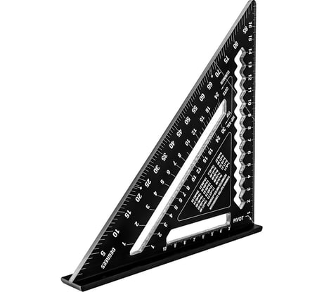 Крашеный алюминий, разметка по краске, слетит сразу. На прямом углу нет выемки для верёвки (но это было видно сразу, просто пожелание). Шкала метрическая почти сходится, для 17 см приемлема. Угловая шкала, 45 градусов держит.