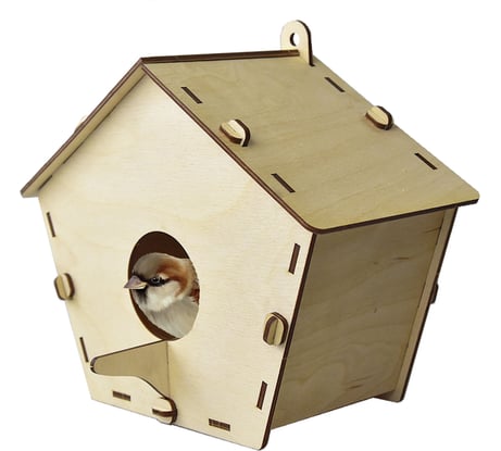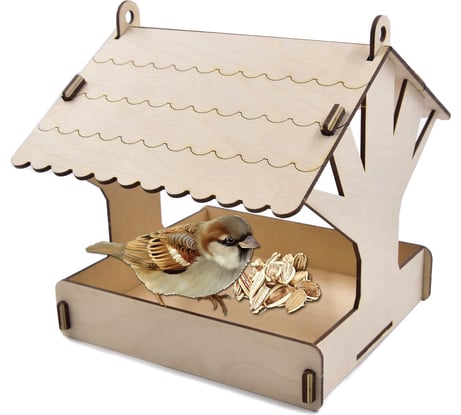 Поставляет в виде плоского пакета, сборка занимает полминуты, все детали выполнены качественно, видно что резали лазером. Конструкция в сборке получается достаточно прочной. В качестве бонус в комплекте два элемента для сборки деревянных птиц, с возможностью повесить на веревку. Фанеру рекомендую пропитать маслом или защитным лаком для дерева для продолжительного срока службы.