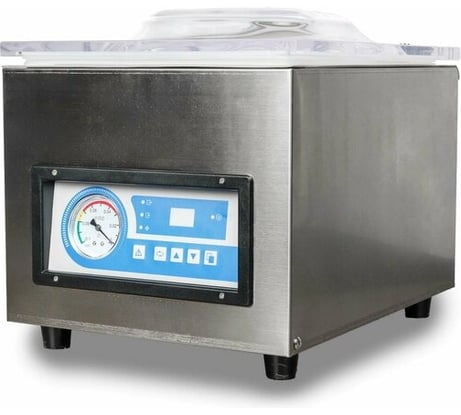Хорошо вакуумирует, тяжелый, большая камера. Впритык влез пакет 25х35. Запаяло без проблем.