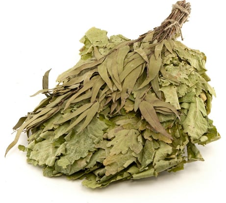 Дубовые листья и смесь трав, при запаривании аромат отвал башки. Крепкий, быстро не осыпается.