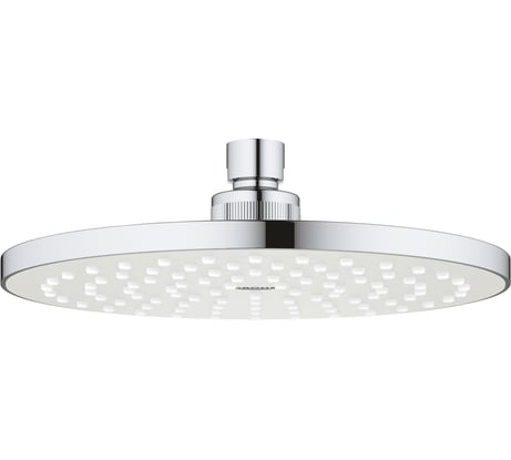 Упаковано в коробку с картинками, которая к тому же в три раза больше содержимого (обычно у GROHE одноцветная компактная синяя упаковка). Корпус пластиковый, диаметром 21 см. Шариковый шарнир позволяет при необходимости отклонить верхний душ на значительный угол. В комплекте идет сеточка и уплотнительное кольцо. Отверстий в данном душе больше, чем в более дешёвом варианте душа с диаметром 20 см
