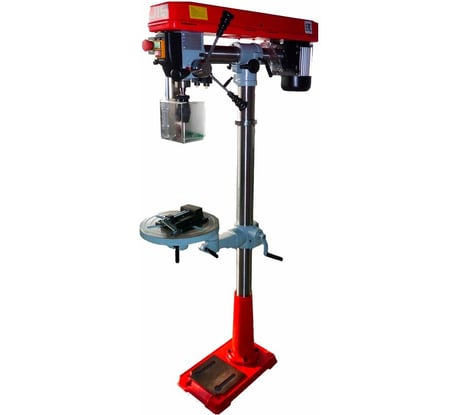 Основание станка осталось как у станков меньшего размера и веса. Стойка из тонкостенной трубы. Крепеж к основанию на 4 болта 8мм очень сомнительный. Стол как холодец при надавливании сверлом ходит ходуном. Станок неотбалансирован. При полном перемещении назад стремится опрокинуться. Выдвинуть вперёд при помощи ручки не удаётся приходится мотор приподнимать. Ну и в довершение биение в 1мм на конце сверла. Нового 10мм!