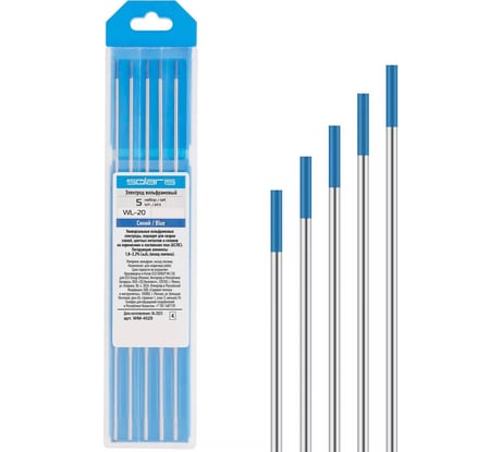 Электрод вольфрамовый синий WL-20 3.2 мм., SOLARIS WM-4514 обладает универсальными характеристиками, поэтому подходит для большинства работ. В качестве легирующей добавки выступает оксид лантана.Быстрый поджиг и стабильность дуги позволяет качественно выполнить сварку элементов. Применял на углеродистой стали результат хороший, сварной шов получается качественный.