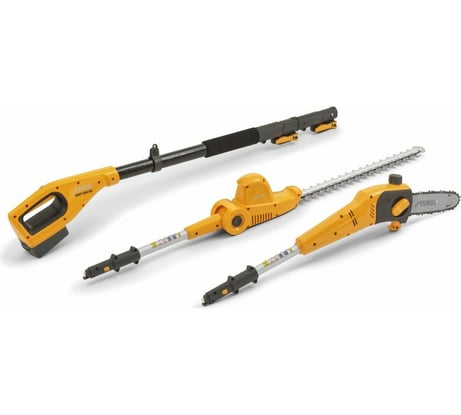 Не требует сетевого питания, что удобно в период отключения электричества. Мощная, но не тяжелая АКБ в комплекте с зарядным устройством. Батареи хватает надолго - подрезка четырех высоких деревьев (сухие и "живые" ветки) на одном делении АКБ при предварительно полной зарядке. Довольно тихий в работе. Насадку-кусторез за счет возможности наклона режущей части можно использовать в качестве триммера для сухостоя. У насадки с цепной пилой есть крючок для снятия срезанных веток и подвешивания инструмента. Существуют модели с большей рабочей высотой. Но этой вполне достаточно для сезонных и не профессиональных работ без использования стремянок. Рез ровный, кору не дерёт, соседние ветки не царапает.