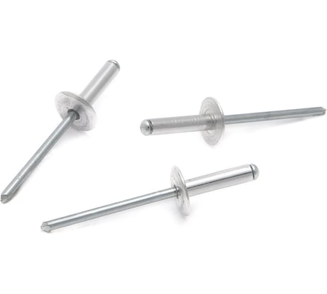 Классические вытяжные заклёпки, но с более широкой шляпкой, приобретал для приклепывания поворотной резиновой полосы к воротам. За счёт более широкого бортика (шляпки) резина не продавливается при заклепывании, длина заклепки как раз, какая нужна для моей задачи. Ранее ремонтировал стеклопластиковую байдарку-немку, с разрывом борта, такими заклепками - тоже нормально. Отлом стержня четкий, ниже среза шляпки, острие не торчит, усилие отлома достаточно сильное, что обеспечивает достаточный поджим соединяемых деталей. Диаметр шляпки заклепки - 12мм (у обычной около 9мм), длина тела заклепки - 10мм, диаметр тела заклепки - 4мм.
