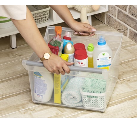 Контейнер на колесиках,точно встал в полку шкафа, храню там всякие средства, так они точно не испачкают шкаф. И не смотря на общую тяжесть за ручку можно легко вытянуть контейнер и достать средство.