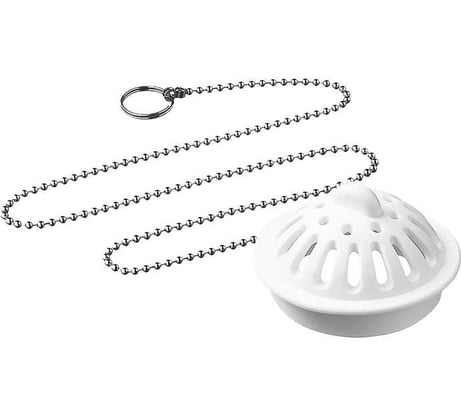 В меру мягкая, чисто белаяеталле цеочки и колец резина. Цепочка и кольца прочные, что редкость в наше время, особенно для колец. Покрытие на металле цепочки и колец ровное, блестящее. По диаметру подошла к сливу.